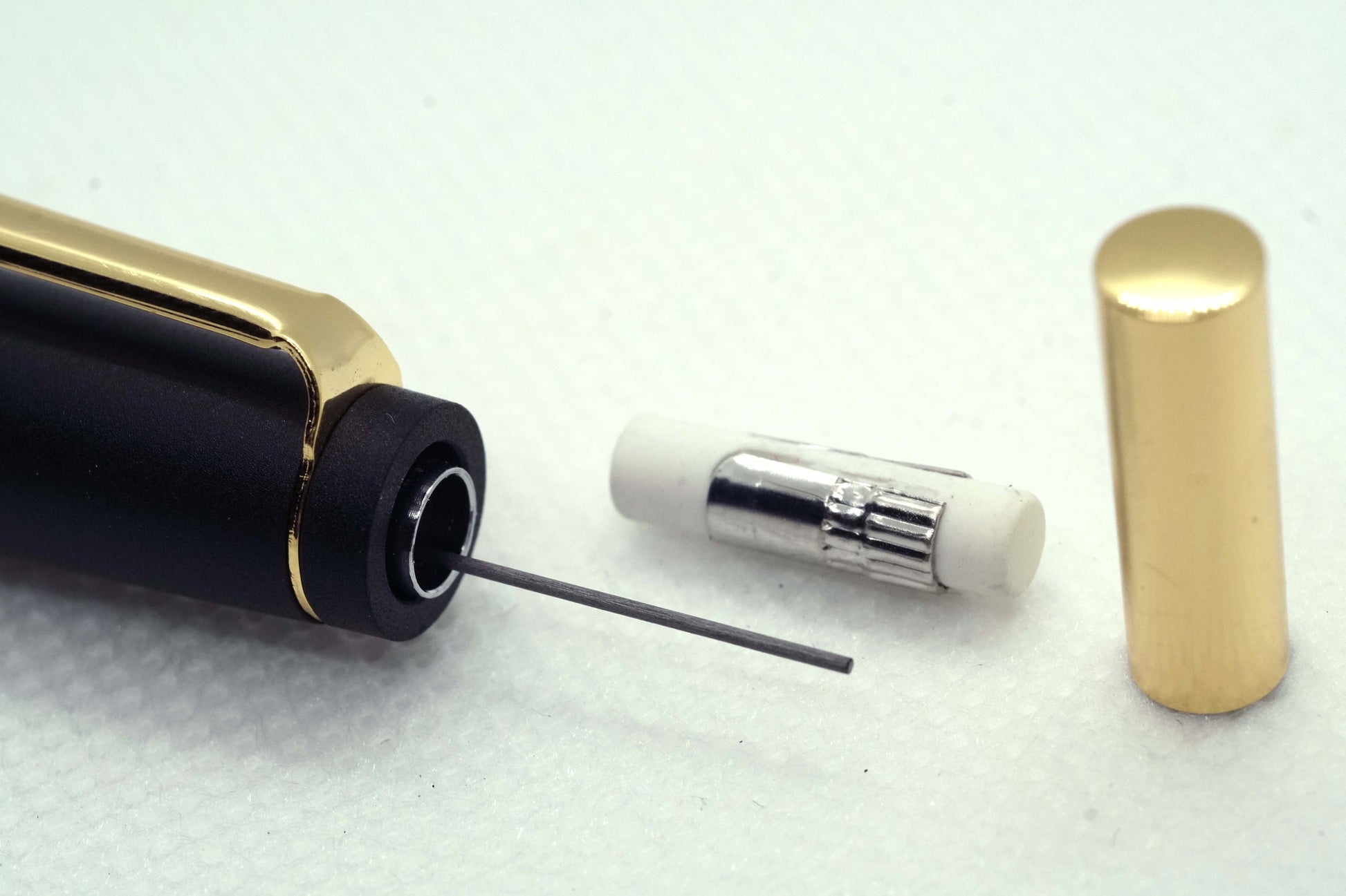テール側のキャップ、消しゴムを外し替芯を補充してください。替芯の太さは0.5mmです。