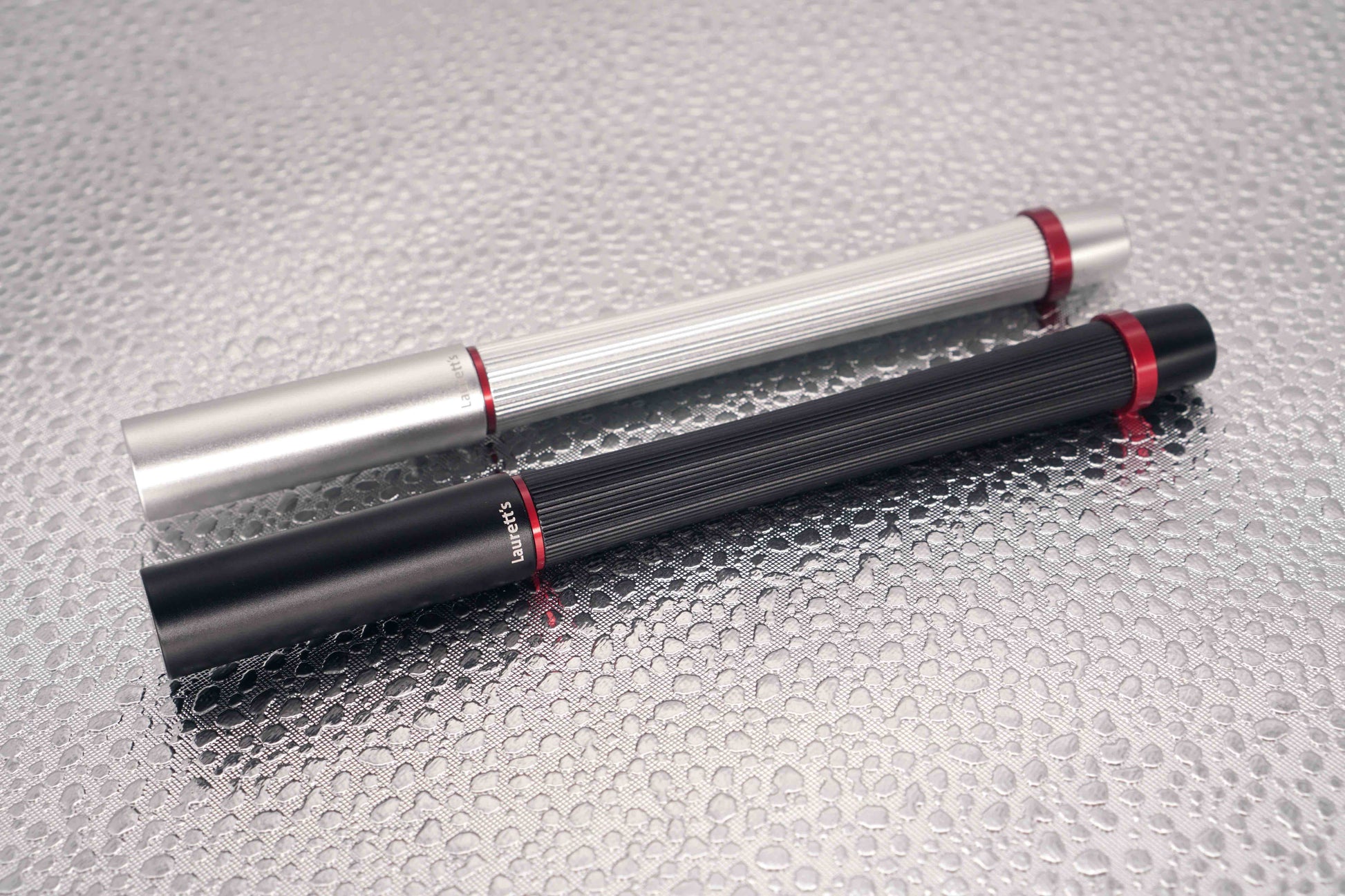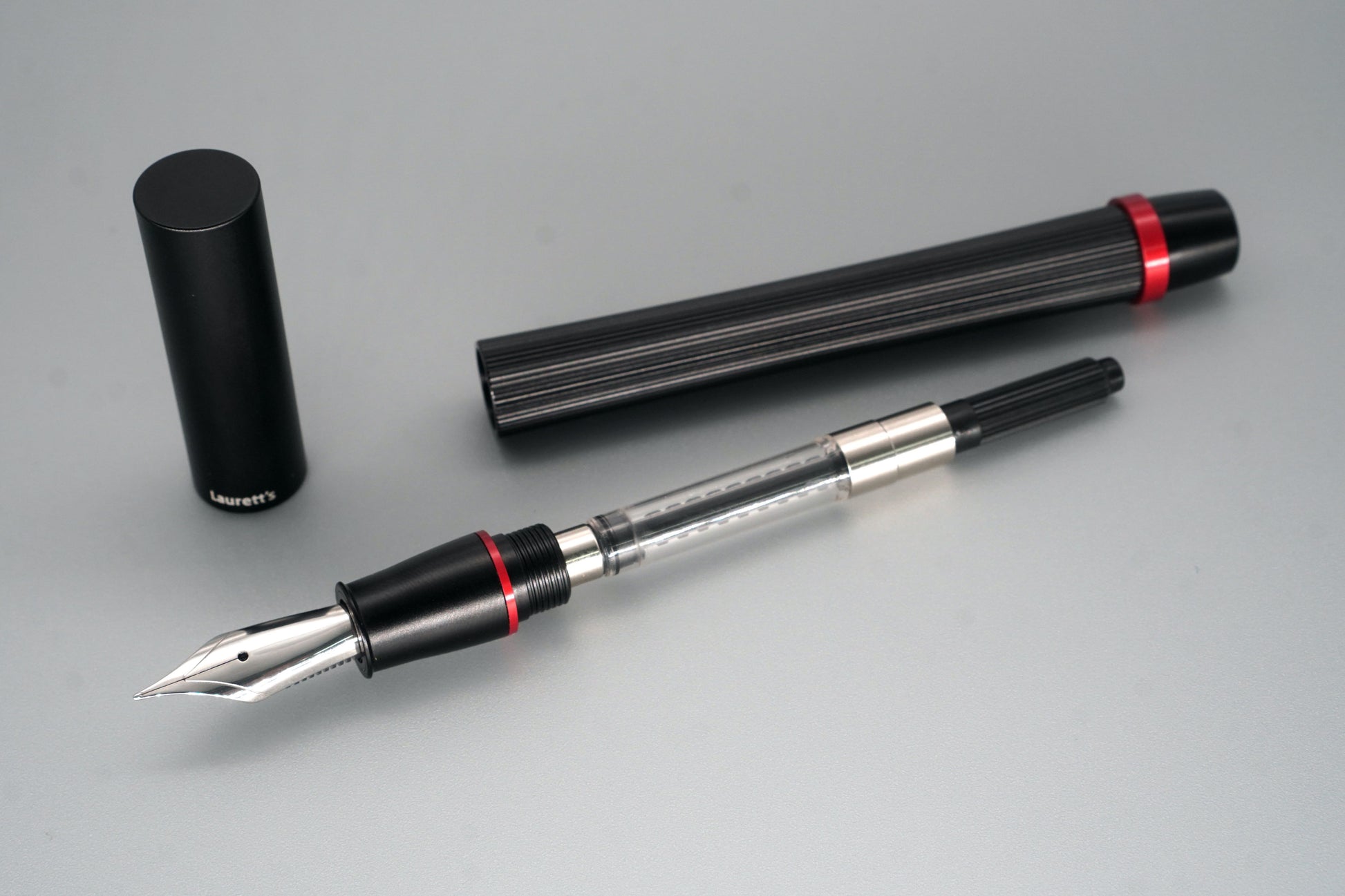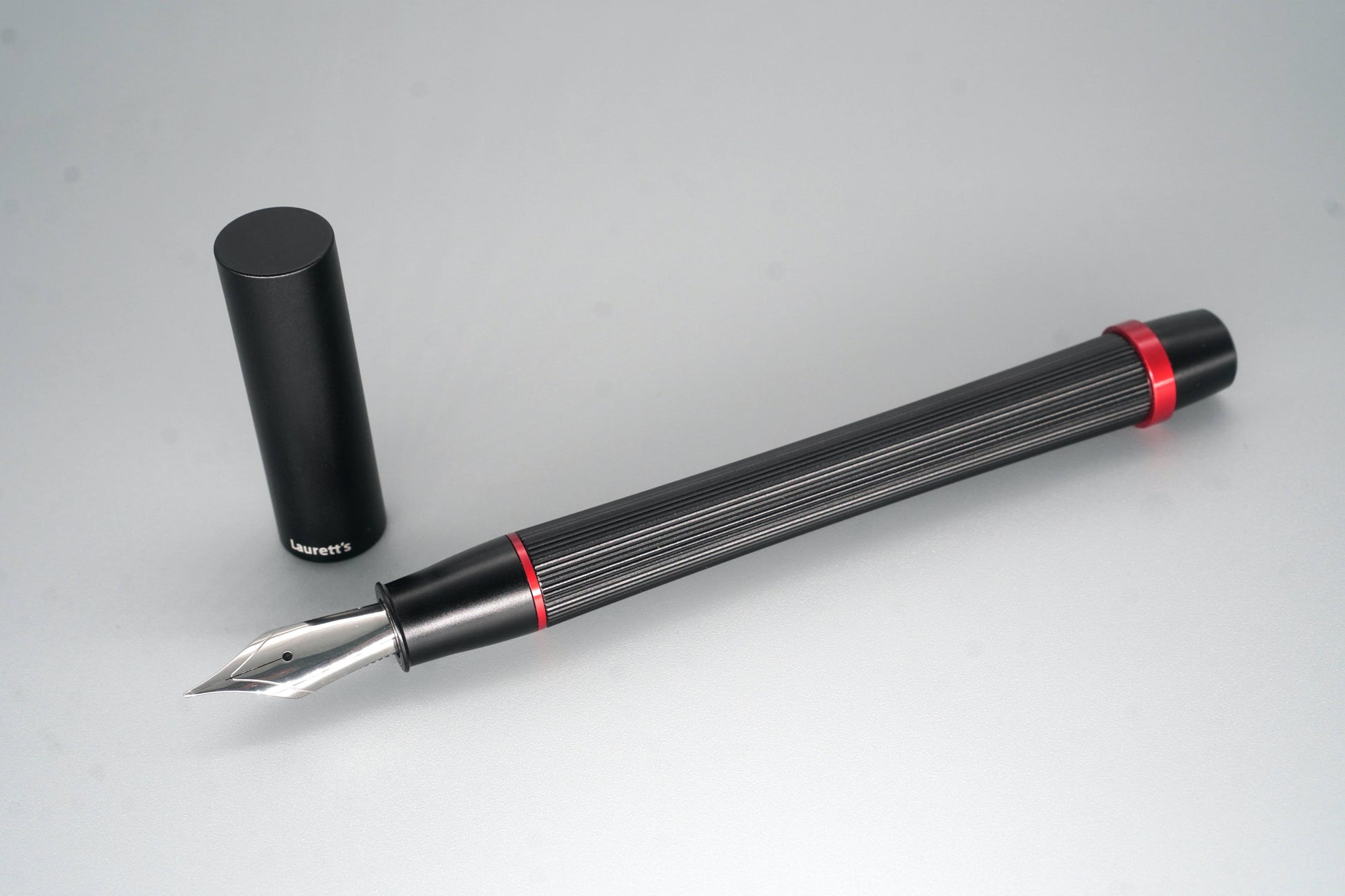 Laurett's Spinner 万年筆は、さりげないくびれを取り入れることで全体のシルエットを美しく仕上げ、さらにくびれ形状に沿ったRローレット加工を施すことで、よりスタイリッシュに、筆記性も高めました。軽量ながらもバランスのとれたSpinner万年筆は気軽に手に取りやすく、筆記意欲をかき立てることでしょう。エンド側には転がり防止のためのDカットリングを装備。